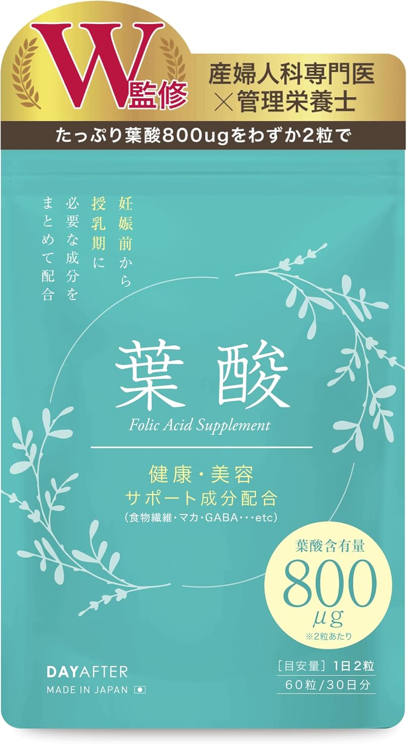 葉酸の推奨摂取量は通常時240μg、そして妊活中・妊娠初期は640g、妊娠中期~後期は480μg、授乳時は340μgと言われています。DAYAFTERの葉酸サプリは時期によってお選びいただけるよう、2つのラインナップをご用意いたしました